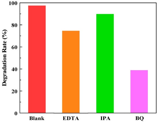 In order to further reveal the degradation mechanism, a free radical capture experiment was performed by adding equal molar amounts of IPA, BQ, and EDTA scavenger reagents for ·OH, ·O2−, and h+, respectively []. Figure 11 illustrates the TC photodegradation rates with different radical scavengers. Compared with the blank experiment, the TC degradation rate changed weakly after adding IPA but significantly reduced after adding EDTA and BQ. Especially in the presence of BQ, photocatalytic activity decreased from 98% to 38%. This indicates that ·O2− and h+ are the predominant influential active species in the TC degradation reaction, while OH has relatively little effect.