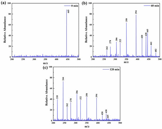 Mass spectra of TC degradation with FTC-15 under (a) 0 min, (b) 60 min, (c) 120 min.