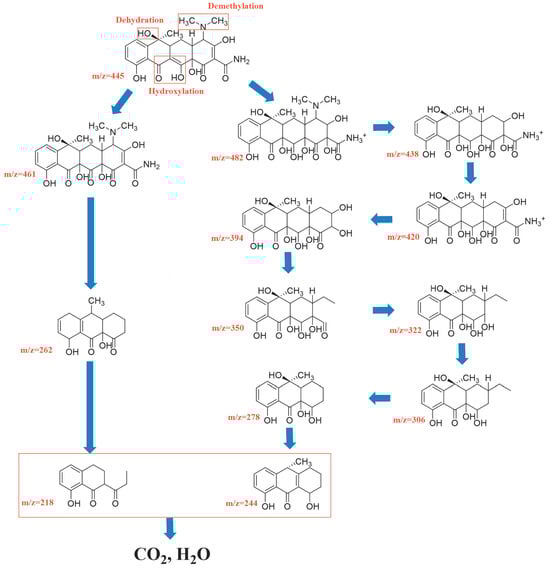 The intermediates formed during the TC degradation process were explored by the LC–MS technique. In Figure 12a, a strong peak at m/z = 445 is ascribed to the protonated tetracycline molecule (TC-H+) by stripping Cl− ions []. After degradation for 60 min (Figure 12b), the peak intensity at m/z = 445 decreased significantly, while new peaks appeared at m/z = 482, 461, 438, 420, 394, 350, 322, 306, 278, and 262, indicating that the TC began to be degraded and formed small molecule intermediates through dehydration, demethylation, and hydroxylation []. After degradation for 120 min (Figure 12c), the peaks at m/z = 482, 461, and 445 almost disappeared, while the peak intensity at m/z = 322, 306, 278, and 262 increased, and some new peaks appeared at m/z = 244 and 218. These results suggest that intermediates can be further degraded until they are finally mineralized into CO2 and H2O, which is consistent with TOC test results []. The possible reaction pathway during TC degradation is shown in Figure 13.