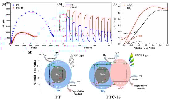 EIS profiles, TPC responses, and Mott–Schottky plots of the as-prepared samples were measured by the electrochemical workstation. As presented in Figure 14a, the arc radius of the Nyquist curve for FTC-15 is much lower than FT, confirming its smaller impedance ability and higher photoinduced charge carrier separation rate []. Meanwhile, the TPC responses in Figure 14b indicate that the photocurrent density of FTC-15 is much higher than FT, indicating its better-photoinduced charge carrier transport ability []. These results further validate that the heterojunction between TiO2 and g-C3N4 can largely enhance photocatalytic performance. According to Figure 14c, the conduction band (ECB) edge potential of g-C3N4 and TiO2 are estimated to be −0.40 and −0.31 V (vs. NHE), thus the valence band (EVB) edge potential of g-C3N4 and TiO2 can be calculated to be +2.5 and +3.16 V (vs. NHE), respectively, by using the formula EVB = ECB + Eg. From the aforementioned results, a possible photocatalytic degradation mechanism is shown in Figure 14d. Due to extensive well-dispersed mesoporous structures and active sites such as hydroxyl groups on the FT and FTC-15 samples, TC molecules can be adsorbed onto their surfaces in a darkroom adsorption process. Subsequently, under Xenon lamp irradiation, TC molecules undergo photocatalytic degradation. For the FT sample, TiO2 can absorb ultraviolet light and produce photoinduced electron (e−)/hole (h+) pairs, while Fe3O4 acts as an electron acceptor, reduces the e−/h+ pairs recombination rate on TiO2, and also provides magnetic recycling conditions for photocatalysts, thus prolonging the catalyst lifetime [,,]. For the FTC-15 sample, g-C3N4 in the sample can absorb visible light and produce photoinduced e−/h+ pairs. Considering the ECB of TiO2 is more positive than g-C3N4, e− on g-C3N4 CB can readily transfer to TiO2 through the heterojunction structure. Meanwhile, h+ on the TiO2 valence band (VB) can also transfer to g-C3N4 through the heterojunction structure due to the EVB of g-C3N4 being more negative than TiO2, thereby extending the photoinduced charge carrier’s lifetime [,]. In addition, the photoinduced electrons accumulated on the conduction band (CB) of TiO2 and g-C3N4 can reduce dissolved O2 into ·O2−. Subsequently, predominant influential active species (O2− and h+) further oxidize and decompose TC pollutants. Here, h+ does not react with H2O to generate OH since the g-C3N4 VB level is more negative than ·OH/H2O (2.68 V vs. NHE) [], which is in agreement with the free radical capture experiment results.