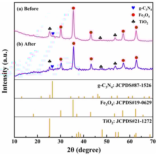 XRD patterns of FTC-15 photocatalyst (a) before usage and (b) after five cycles of usage.