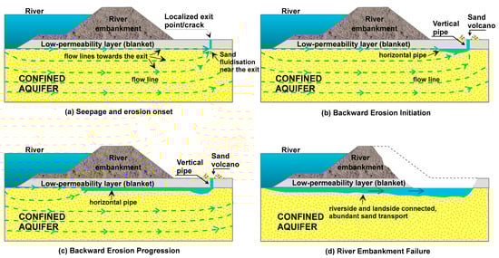 Figure 1a–d show how seepage in a confined aquifer beneath a thin fine-grained top layer (the latter being typically referred to as the “blanket”) drives the onset of erosion and leads to failure. During flood events, indeed, the increase in the water level of the river causes, in turn, a significant increase in pore water pressure in the confined aquifer, as a consequence of their hydraulic connection, and the uplift pressure may create a localized exit spot in the blanket. Then, flow lines concentrate towards this discharge point landside, and the resulting upward seepage pressure can lead to sand fluidisation inside the hole, this being an early sign of the initiation of the erosion process: sand basically looks like a boiling fluid, hence the name “sand boil”. It is worth mentioning that the exit hole can also be a pre-existing discontinuity in the blanket, either natural or artificial, as well as any other weak point. Once triggered, the erosion may develop at the roof of the aquifer, in a direction opposite to the groundwater flow (i.e., towards the river), forming a single small open conduit or a net of such conduits, typically referred to as “pipes”.