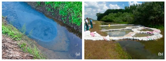 (a) A sand volcano created at the ground surface, inside a ditch, during the November 2023 reactivation of a historic sand boil along the Po River, close to the delta (Mazzorno, Ferrara province, Italy); (b) chain of sand boils along the Danube River, in Hungary (courtesy of ÉDUVIZIG).