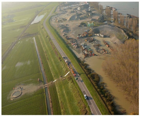In the Netherlands, 120 and 180 sand boils were detected along the Rhine, Waal, IJssel and Meuse rivers, in the years 1993 and 1995, respectively, thus revealing the susceptibility of the river embankment systems of this area to backward erosion piping phenomena []. Other major river embankment systems that regularly suffer from piping activity are those of the Danube, especially in Hungary, where 165 single sand boils and 13 line-wise sand boil chains (from 20 to 150 m long) were triggered during major high-water events that occurred from 1965 to 2013 [].