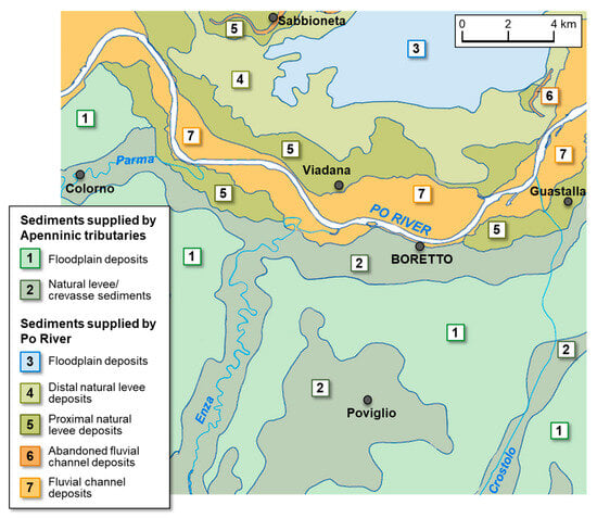 Shallow geophysics, cone penetration tests and boring data have been used in recent years to better understand the stratigraphic arrangement of the subsoil and its influence on piping phenomena. From a geological point of view, the shallowest soil deposits encountered in this area are part of the so-called Upper Emilia-Romagna Synthem—in particular, the Ravenna Subsynthem (AES8) of Holocene age—and result from sediment accumulation in a continental depositional environment, due to both the Po River and the Apennine tributary rivers, as shown in Figure 5 []. This facies association typically includes (i) fine to very fine sands at the plain level or fine to very coarse sands slightly below, referable to fluvial channel sand deposits; (ii) silts and sandy silts, referable to channel fill deposits located along the traces of relict hydrography; and (iii) clays, clayey silts and silty clays located in topographical depressions and interpreted as floodplain deposits. In particular, typical meandering river floodplain deposits characterise the subsoil beneath the river stretch under consideration.