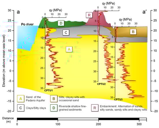 The stratigraphic model of the river embankment system depicted in Figure 6 has been obtained by interpreting piezocone tests (CPTU) carried out along the representative cross-section a-a′ (drawn in Figure 3b), located in close proximity to the sand boil shown in Figure 4. The tests are part of a dataset collected for the project SISMAPO [,], whose objective was the seismic stability assessment of about 90 km of embankments along the middle–lower stretch of the Po River. Site investigations allowed the identification of the following five different soil units: (i) Unit R, given by a complex alternation of sands, silty sands and clayey silts forming the river embankment; (ii) the highly heterogeneous Unit A, i.e., a thick fluvial channel sand body referred to as the Padano Aquifer, composed of medium-fine to coarse and very coarse sands subjected to the erosion process in case of piping; (iii) a predominantly silty unit (Unit B), typically attributable to a natural levee depositional environment; (iv) a clayey soil layer labelled as Unit C, 4 to 10 m thick, to be interpreted as a deposit of floodplain environment; and (v) the fine-grained sediments of Unit D, forming the upper 4–5 m of the riverside floodplain area. From the river embankment profile shown in Figure 6, the elevation of the riverside floodplain area appears to be higher (up to +3 m) than the landside area, also as a consequence of some earthworks related to activities in the industrial settlements located therein.