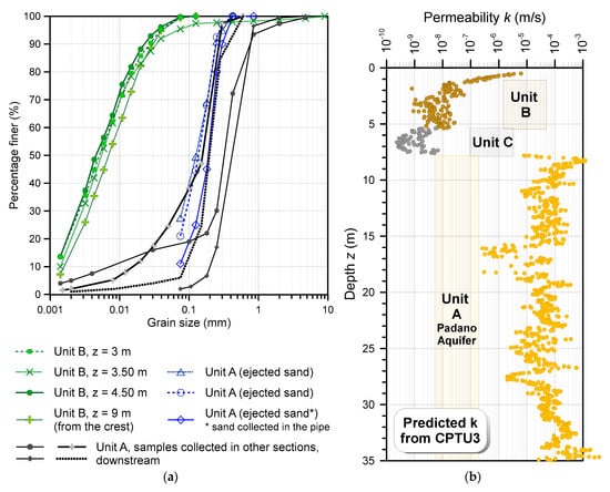 Particle-size analyses by the sedimentation method on a few fine-grained soil samples, extracted from nearby boreholes, have confirmed the prevalence of the silty fraction in Unit B, as shown by the curves of Figure 7a. Examples of particle-size distribution curves, determined by sieving coupled with the sedimentation method, have been reported also for Unit A, though referred to samples recovered from the Padano Aquifer at a few kilometres away from the study area discussed herein. In spite of a certain heterogeneity that has been recognized by various authors (e.g., Martelli et al. []), the upper portion of the Padano Aquifer is typically composed of medium-fine, uniform sands; at times, a small or moderate amount of silts can be encountered in the shallowest layers. For a useful comparison, the grain size distributions of the ejected sand, collected in the volcano crater and in the pipe during the November 2019 reactivation of the historical sand boil in Boretto, are also shown in the figure.