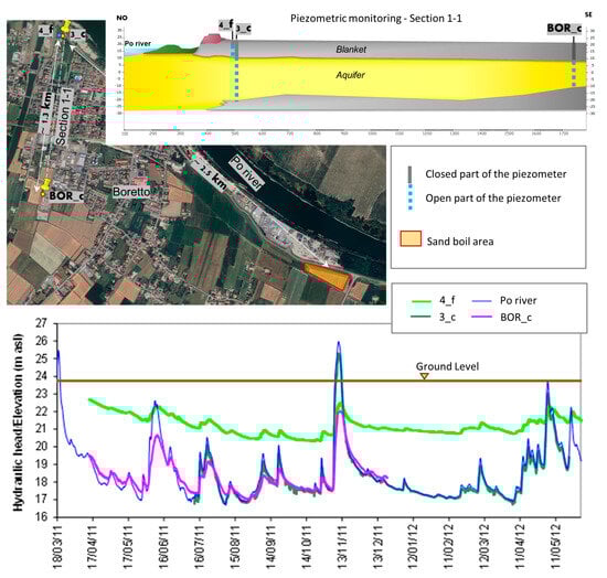 These data were collected in a section equipped with piezometers, located 2.5 km from the area affected by sand boils. The piezometers, two of them installed in the confined aquifer (labelled as 3_c and BOR_c) and one in the phreatic (labelled as 4_f), were placed at different distances from the river. They provided evidence of a phreatic surface located in Unit B (piezometer 4_f in Figure 8), mainly governed by rainfall and evapotranspiration but also sensitive to the river regime. The confined aquifer, located in Unit A, appeared instead to be well-synchronized with the river (piezometer 3_c), also at significant distances, according to what was recorded on a piezometer 1.3 km away from the riverbed (piezometer BOR_c). As shown by the collected data, most of the time, the piezometric level in the confined aquifer turns out to be 2–5 m lower than the phreatic surface, thus causing the confined aquifer to drain the unconfined one. By contrast, during major high-water events, this condition is reversed and the piezometric surface of the Padano Aquifer may be higher than the phreatic level. Such an increase reached 2.5 m during the high-water event recorded in the monitoring period shown in Figure 8.