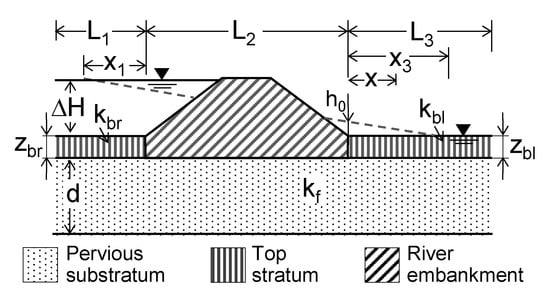 where x1 is the distance from the effective seepage entry to the riverside embankment toe and x3 is the distance from the landside toe to the effective seepage exit, both calculated according to the procedure described in USACE []. H is the net hydraulic head on the river embankment.