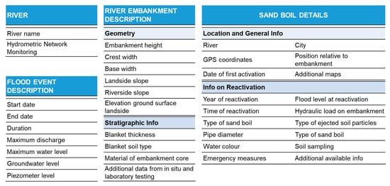 The structure of the “sand boil section”, including in turn different sub-sections, is illustrated in Figure 10. The section has been devised to allow the user to save a wide variety of data useful for a comprehensive description of the existing piping process, i.e., spatial, geometrical and temporal details, coupled with flood characteristics. A summary of the pieces of information that can be entered into the database, encompassing field measurements collected during the flood emergency stage, site investigations and monitoring activity, is provided in Figure 11. Most of these key data are typically collected also in other similar existing databases, in particular the two pioneering examples developed in the Netherlands and previously mentioned []. It must be observed that the field data to be taken of the sand boils during reactivations are generally simple, relatively fast and do not imply the use of complex procedures, having to be compatible with simultaneous emergency activities typically foreseen by the relevant protocols.