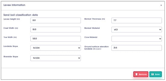 For each river segment affected by the piping evidence, geometric details of the embankment can be entered in the so-called “levee information window”, as shown in Figure 12, for the cross-section being discussed in this paper. This data entry window also allows specifying important stratigraphic details, such as the thickness of the blanket and the soil type (e.g., clay, silty clay, etc.) forming it. These are key pieces of information, as is also confirmed by the analyses carried out in Section 3.2, being indeed capable of affecting the susceptibility to piping of river embankment systems. Further geological, stratigraphic and geotechnical information, in the form of logs from site investigations, laboratory tests on collected soil samples or reports, can be uploaded as additional data in order to provide the most detailed possible description of the sandy aquifer and the overlying blanket layer.