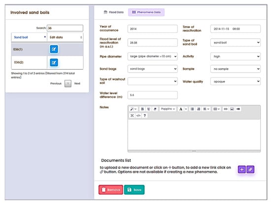 Data entry window of the web application containing details of the sand boil and the piping activity. The entered data refer to the reactivation of sand boil #36(2) in Boretto, during the November 2014 flood event.