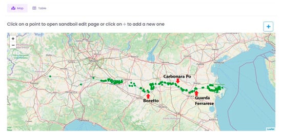 As regards the Po River, following an early attempt at systematic collection carried out by the Po River Basin District Authority (AdBPo) after the major high-water event in 2000 and the next enhanced version of a sand boil database proposed by the Interregional Agency for the Po River [], a GIS-based web application has been recently developed as part of the activities devised by the project LIFE SandBoil (https://lifesandboil.eu/, accessed on 7 April 2024), funded by the European Commission.