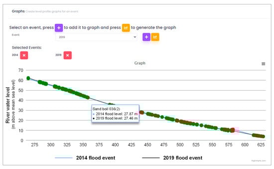 The data stored in the database can be easily exported to standard .xls and .csv files, or interpreted through graphs that are basically meant to compare the effect of different flood events or the response of different historical sand boils during the same high-water event. The sand boil management tool allows the creation of two different types of graph, referred to as (i) river graphs and (ii) historical graphs. The first provides a profile of the maximum river water level reached in a flood event at the different sections monitored for piping, with different symbol colours for activated or non-reactivated sand boils. An example of a river graph is shown in Figure 15, where profiles of the 2014 and 2019 flood events are displayed in the same plot.