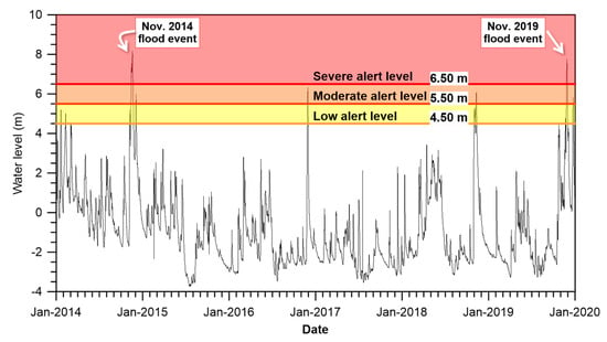 Record of the water level in the Po River from January 2014 to December 2019, provided by the hydrometric station located in Boretto. The datum of the station is 19.9 m above mean sea level. The light orange, orange and ruby red horizontal lines indicate fixed water level warning thresholds, according to AIPo guidelines.