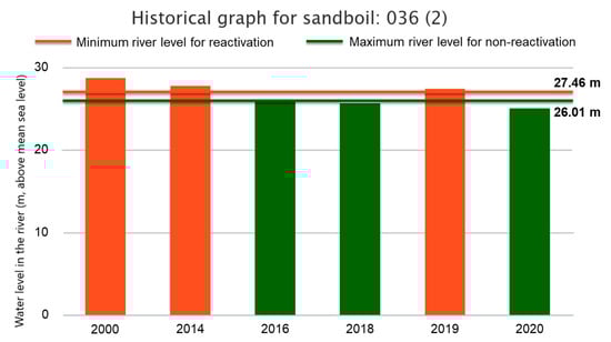 The second type of graph aims at providing an overview of the activations/non-reactivations observed in a single sand boil location for different flood events occurring in the past. The red bars are used to indicate activations or reactivations of the sand boil, whereas the green ones are adopted when no evidence of piping was detected. The bar height provides information on the water level reached in the river section during the flood event. This level can be compared with both the measured minimum water level causing piping initiation in the past (Hmin, red line) and the maximum hydrometric level (Hmax, green line) for which no activation was observed. This type of graph turns out to be very useful for defining threshold values of the water level triggering piping phenomena and thus for supporting early warning and early action systems. An example of a historical graph is shown in Figure 17, with respect to sand boil #36(2) located in Boretto and a few major flood events that occurred in the period 2000–2020. Piping activity in the sand boil was observed in 2000, 2014 and 2019. Furthermore, according to the available records, Hmin = 27.46 m (above m.s.l.) and Hmax = 26.01 m.