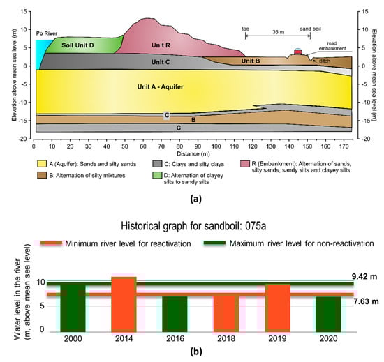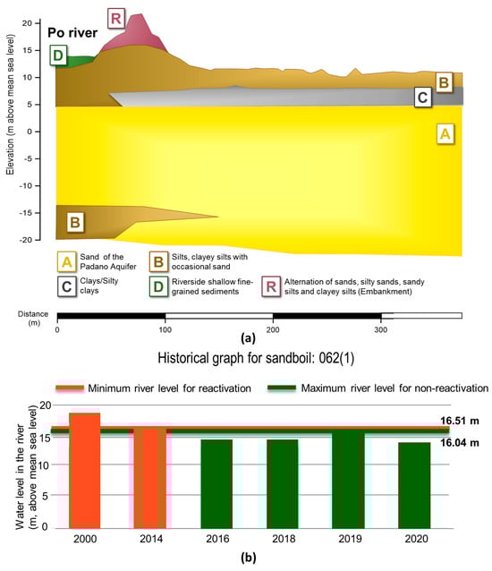 (a) Stratigraphic model of Carbonara Po cross-section; (b) “historical graph” for sand boil #62(1) detected in this area.
