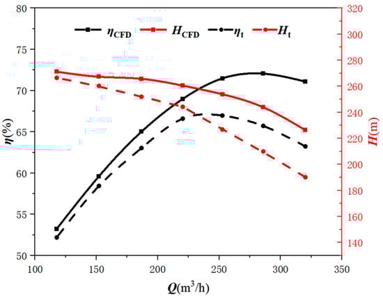 The fire pump model was simulated for seven operating points to fit the head and efficiency performance curves shown in Figure 5: Ht, ηt are experimental data, HCFD and ηCFD are simulation calculation data. Considering that there will be unit loss in the experiment, the simulation efficiency here is the product of hydraulic efficiency, volumetric efficiency, and mechanical efficiency. The calculation results show that the accuracy of the head simulation data is within the range of 0–12%. Because the balance hole is not installed in the impeller part and the front and rear cover plates are not installed in the volute during the simulation calculation, and the leakage loss is ignored, the simulation performance is good. At this time, the simulation accuracy of 0–12% can be used as a judgment basis.