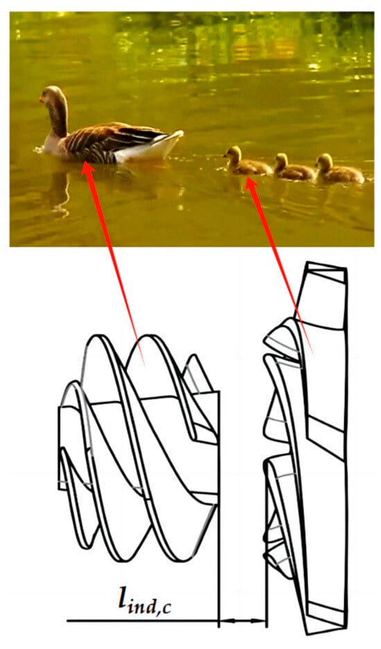 Yuan et al. [] revealed for the first time the reason why waterfowl formation movement can maintain individual energy expenditure by studying the phenomena of wave-piercing and wave-riding in ducklings, and proposed the theory of wave-piercing, that is, by keeping the trailing duckling at the same speed as the mother duck, a stable wave-riding state can be achieved effortlessly, thus maintaining the energy expenditure. Here, the inducer is analogous to the leading mother duck and the impeller is the trailing duckling, and the correspondence is shown in Figure 6; the effect of the inducer trails on the impeller was investigated for different axial distances in order to determine the optimum axial distance.