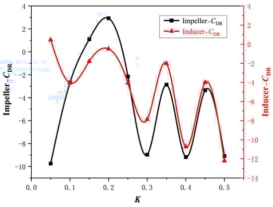 After simulating 10 groups of models with different axial distances, the simulation data were processed, and the drag reduction coefficient was calculated to plot the drag reduction coefficient, as shown in Figure 7, where the x-axis represents the K value of 10 sets of axial distance coefficients, and the y-axis represents the drag reduction coefficient values of the inducer and the impeller.