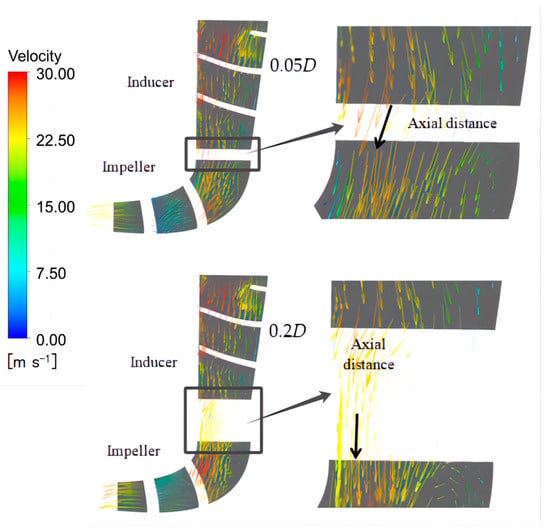 The diagram of the impeller’s head-efficiency reveals that the maximum head-efficiency is attained at an axial distance of 0.2D, followed by a relatively higher efficiency value at 0.05D; however, the corresponding head level remains undesirable. Therefore, the velocity vector diagrams of the inducer–axial distance–impeller under two different axial distances are presented in Figure 10. It can be seen that, with the change of axial distance, the direction of the velocity vector at the impeller inlet will be different. The comparison reveals that at an axial distance of 0.2D, the velocity vector distribution at the impeller inlet exhibits greater uniformity, facilitating a more stable and consistent flow of fluid towards the impeller. Consequently, the performance of the impeller is enhanced at this specific axial distance. In order to further observe the inducer–axial distance–impeller energy loss at each axial distance, the internal flow analysis will be conducted below.
