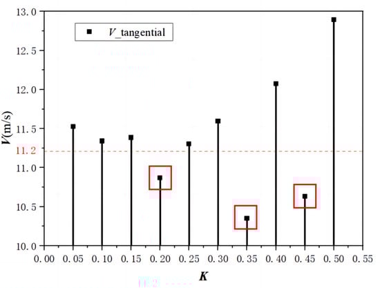 Miao Fei et al. [] studied the energy loss in the water behind the propeller and concluded that a decrease in tangential velocity means a decrease in the loss of rotating wake energy. The following formula is used to express the rotational kinetic energy of unit water area behind the inducer, so as to illustrate the relationship between tangential velocity and kinetic energy: