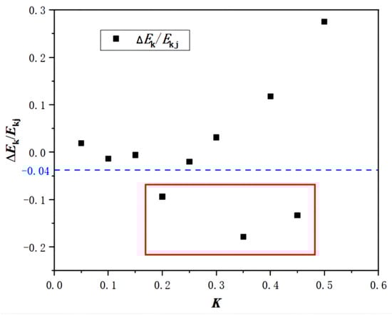 It can be seen from the formula that the reduction in tangential velocity leads to a corresponding decrease in the kinetic energy of the impeller. The conclusion of Miao Fei et al. [] shows that the loss of the rotating wake energy of the impeller is reduced.