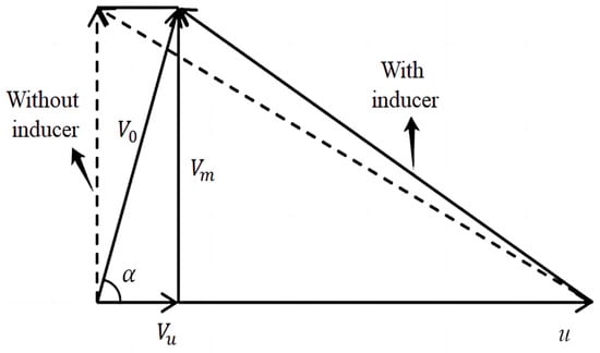 The fluid is directed into the inducer through a bell mouth, where it is guided and accelerated by the blades. As the inducer rotates, it imparts a rotational angle to the fluid, influencing its direction and speed before entering the impeller. This pre-swirl enhances pump performance. At the same time, the pre-swirl effect helps to improve the speed and pressure at the inlet of the impeller, and makes the fluid more evenly distributed on the impeller, which can maximize the use of fluid kinetic energy and increase the power output of the pump. Under the influence of pre-swirl, the velocity and pressure of the fluid entering the impeller after flowing through different axial distances will be different. Meanwhile, as can be seen from the inlet velocity triangle of the impeller in the figure below, the inlet velocity angle of the impeller after pre-swirl by the inducer will change accordingly. As can be seen from the drag calculation Formula (1) in the drag reduction coefficient, the main influencing factor of the drag is its velocity. Therefore, the flow angle at the impeller inlet was introduced to observe the flow conditions at the impeller inlet of models with different axial distances after pre-swirl. The flow angle α at the impeller inlet refers to the angle between the flow direction of the fluid entering the impeller and the impeller inlet, and is the absolute flow angle α at the inlet as shown in the velocity triangle at the impeller inlet in Figure 13. It determines the direction and velocity of the fluid entering the impeller, and the formula is