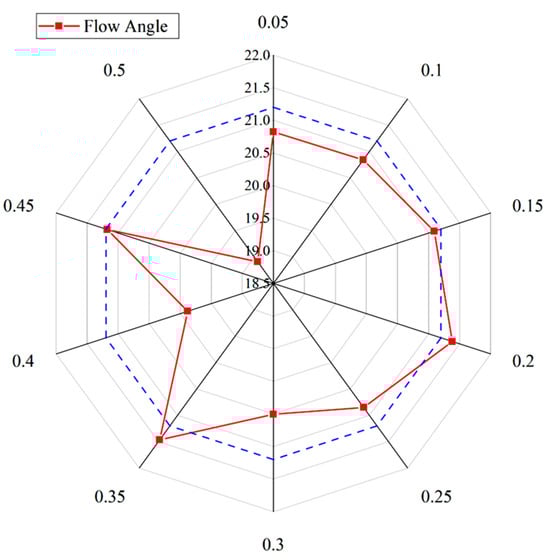 In the last section, three axial distance models of 0.2D, 0.35D, and 0.45D were selected based on the tangential velocity of the wake field behind the inducer to lower the wake energy loss. At this time, the tangential velocity is small, the inlet rotation distortion disturbance is small, and the absolute flow angle at the inlet of the impeller is large. Figure 14 shows the radar chart of the absolute flow angle at the impeller inlet of different axial distance models to observe the flow state at the impeller inlet. Circular data of 0.05–0.5 in the figure represent different axial distances KD, and data of 18.5–22.0 represent the absolute flow angle at the impeller inlet. It can be seen that the flow angles at the impeller inlet of different axial distance models are quite different. Draw the blue baseline with flow angle of 21.2°, which allows for a better separation of the axial distance models with the largest impeller inlet flow angle, and observe that the three groups of axial distances of 0.2D, 0.35D, and 0.45D are all greater than or equal to 21.2° from the inlet flow angle of the model impeller. At this time, the inlet flow angle is relatively large, that is, the inlet negative impulse angle is reduced, the impact loss is reduced, the turbulence effect is reduced, and the hydraulic performance is improved.