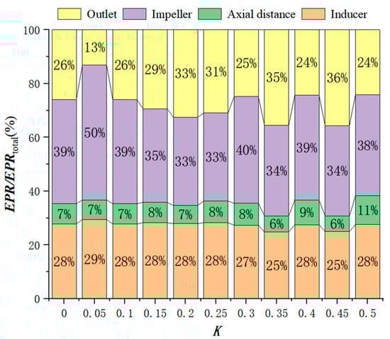 In order to observe the entropy production proportion of each flow-passing component under each axial distance, the following entropy production percentage distribution diagram is drawn, where EPRtotal is the sum of the entropy production value of the flowing parts, compared with the inducer and the impeller, and the inlet pipe of the fire pump has a relatively simple structure, low flow rate, simple turbulence structure, and low entropy production value. The proportion of flowing parts in the figure does not show the inlet entropy production. Since the axial distance is located at the subsequent design to the centrifugal impeller inlet, the entropy production of the axial distance is taken as a part of the entropy production of the impeller. It can be seen from the entropy production ratio chart that the highest entropy production of each model occurs at the impeller. Since the focus of this paper is to analyze the inflow situation in the impeller area, the entropy production of the impeller is analyzed in this paper. As can be seen in Figure 15, the entropy production ratio of the axial segment and the impeller is relatively low at 0.2D, 0.35D, and 0.45D, all being 40%. However, there is a 1% difference in the axial distance ratio of 0.2D compared with that of 0.35D and 0.45D at this time. Since the total entropy production values of each model are different at this time, the entropy production ratio chart cannot reflect the actual entropy production, so there is a 1% difference in the entropy production ratio.