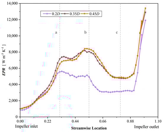 To further observe the real value of entropy production inside the impeller, Figure 16 is drawn to show the absolute value distribution of entropy production between the impeller and the axial distance under different axial distances. It can be seen that the three groups of models with the same proportion of entropy production of the impeller–axial distance, 0.2D, 0.35D, and 0.45D, have significant differences in the absolute value of entropy production. In the 0.2D model, the entropy production value generated by the axial distance is the smallest, and the entropy production value generated by the impeller is also relatively low. At this time, the overall entropy production value of the impeller is the lowest, which means that the energy loss of the impeller is the smallest when the axial distance is 0.2D. In order to further observe the internal energy loss of the impeller, the entropy production distribution from the impeller inlet to the outlet will be carried out below.