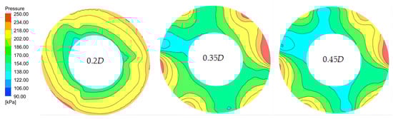 The entropy production value of the axial distance of 0.2D at the inlet of the impeller is lower than the axial distance of 0.35D and 0.45D, because the flow out of the 0.2D axial distance is more uniform and stable when entering the impeller. Figure 18 shows the pressure distribution cloud map of the impeller inlet section. It can be seen that the pressure distribution of the inlet section of the impeller with an axial distance of 0.2D basically maintains the radial gradient without obvious circumferential distortion. At this time, the inlet flow is more uniform. After entering the impeller, the flow rate of the fluid from the impeller inlet to the blade inlet will change due to the influence of the geometry of the impeller, resulting in an increase in the entropy production value at the position of 0–a. In order to further observe the internal velocity distribution, Figure 19 is drawn to show the blade velocity expansion diagram of inducer–axial distance–impeller. It can be seen that when the fluid flows from the axial distance to the impeller, the absolute velocity increases rapidly after the superposition of the inflow velocity and the relative velocity; at the same time, the fluid obtains the energy transferred by the impeller, and the high-speed zone appears at the leading edge of the blade (the characteristics of the front-loaded cascade). Since entropy production is related to flow velocity caused by the average velocity of the fluid, the entropy production curve in the leading-edge region of the blade 0–a in Figure 17 climbs rapidly.