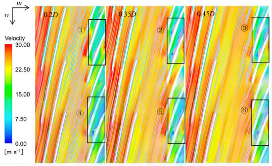 Expanded flow surface diagram of inducer–axial distance– impeller velocity (the first row of blades is inducer, and the second row is impeller, ①②③④⑤⑥ is the vortex generating region).