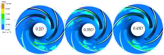The entropy production value in the a–b region exhibits a phenomenon of persistent oscillation. Due to the influence of the impeller blade inlet, fluid separation and flow occur in this region. As can be seen from the blade velocity expansion diagram in Figure 19, the velocity is obviously reduced after the separation flow occurs at the impeller blade, and the fluid flow is unstable at this time. The impeller blade area is prone to the formation of non-equilibrium strong transport turbulence. Figure 20 shows the turbulent kinetic energy distribution at 0.2D, 0.35D, and 0.45D impeller blades and hub. It can be seen that the six impeller blades are accompanied by different degrees of turbulence at the flow separation respectively. According to Equation (11), entropy production caused by turbulent pulsation is related to the size of turbulent energy. Therefore, the oscillation of the entropy production value in the a–b region is due to the periodic flow separation of blades at this location, which intensifies the production and dissipation of turbulent energy, thus causing entropy production and energy loss. Figure 20 shows that the turbulent kinetic energy distribution ranges of the 0.35D and 0.45D models are significantly larger than that of the 0.2D model. In addition, at the ①②③④⑤⑥ selected in the blade expansion diagram shown in Figure 19, it can be seen that the three groups of axial models all produced vortices at the blade suction surfaces to varying degrees. When looking at the position of ①②③, it can be seen that the position ① corresponding to the 0.2D axial distance model has a high absolute flow angle (Figure 14) accompanied by a low angle of attack, so the streamline of the suction surface is not prone to flow separation and the distribution is more uniform. On the contrary, there are large-scale separation vortices at the position of ②③. Therefore, the size of the distribution range of turbulent kinetic energy and vortex shows that the flow of the model with an axial distance of 0.2D is more uniform and stable at the impeller blade, so the entropy production value is lower here.