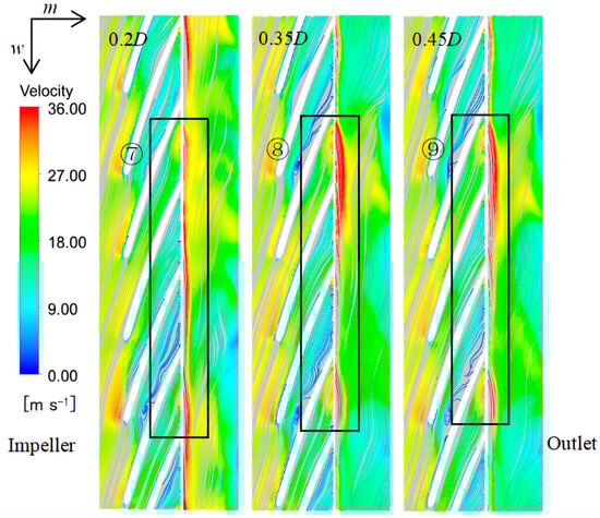 The b–c region is located in the middle part of the impeller blade. At this time, after the leading-edge separation flow mixes with the mainstream flow, the flow gradually tends to be stable, so the entropy production value first decreases and then tends to be stable. Then, the entropy production value increases sharply at the exit of the impeller (c–1.0). Ren Y et al. [] proposed that the flow loss at the impeller outlet in centrifugal pumps is primarily attributed to the dynamic and static interference effects, as investigated through the application of entropy production theory. Figure 21 is the expansion diagram of the impeller-outlet velocity. The velocity of the fluid suddenly increases when flowing from the impeller to the outlet. It can be seen that high-speed zones of different sizes appear at ⑦⑧⑨ places. At this point, which is located at the junction of the impeller and the outlet, the pressure decreases at a faster velocity. Moreover, the dynamic and static interference effect at the outlet of the impeller, namely the blocking effect of the outlet on the wake of the blade, causes a sharp increase in the velocity, which in turn causes an increase in the entropy increase curve c–1.0. Meanwhile, it is evident that the high-velocity zone at the outlet of the 0.2D axial distance model exhibits a significantly smaller extent compared to those of the 0.35D and 0.45D models, that is, the 0.2D axial distance model is less affected by the dynamic and static interference effect, so the entropy production value of the 0.2D axial distance model in the c–1.0 region in Figure 17 is the lowest.