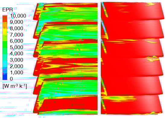 Equation (7) shows that the entropy production caused by the average velocity is only related to the flow velocity, Equation (10) is the entropy production caused by turbulent pulsation. It can be seen that the entropy production is related to the turbulence eddy frequency and the turbulence kinetic energy. It also further explains that the turbulent motion state of fluid caused by velocity change will affect the energy loss of the pump. Next, the EPR (Entropy production) distribution maps of different situations will be drawn to analyze the internal energy loss of the pump.