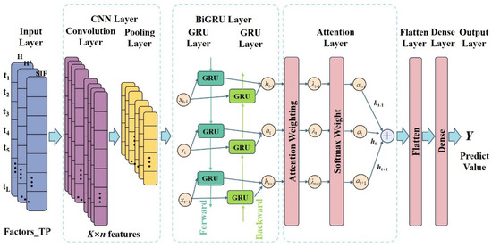 where GRU( ) represents a nonlinear transformation of the time series; is the input factor; and are the forward and backward hidden layer state output, respectively; and represent the corresponding weights; and represents the hidden layer bias of .