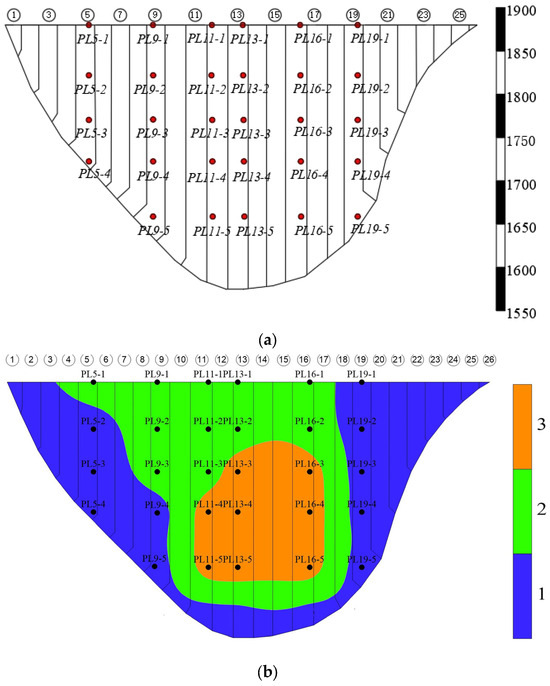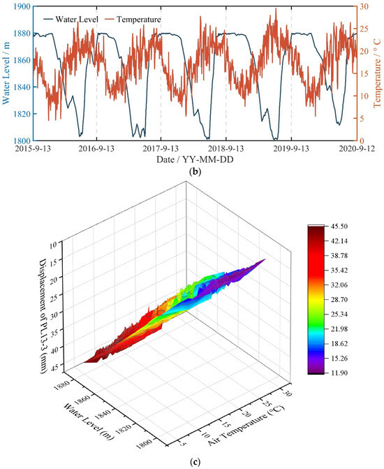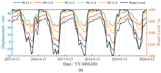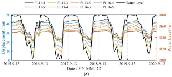 The arch dam is situated along the Yalong River in Sichuan Province, China. The multi-year average streamflow at the dam site is 1220 m3/s, and the multi-year average annual runoff is 38.5 billion m3. Its foundation surface stands at an elevation of 1580.0 m, while the maximum height of the dam reaches 305.0 m, with a total of 25 dam sections. The normal storage level is 1880 m. The total storage capacity is 7.76 billion m3, and the regulatory storage capacity is 4.91 billion m3, which is an annual regulatory reservoir. The foundation rock is marble. The dam was constructed with zoned concrete casting, with a concrete elastic modulus of 32~39 GPa and concrete density of 2475 kg/m3. Plumb lines were installed in seven dam sections to monitor the horizontal displacement of the dam body. The horizontal displacement data (upstream and downstream direction, downstream is positive) of a total of 29 measurement points on the plumb line of the 5#, 9#, 11#, 13#, 16#, and 19# dam sections were selected for analysis. The selected measurement points are shown in Figure 3a. The analysis period was from 13 September 2015 to 12 September 2020, with five years of valid deformation data. Among them, the first 80% of the measurements were used for model training. The last 20% of the measurements were utilized for model testing.