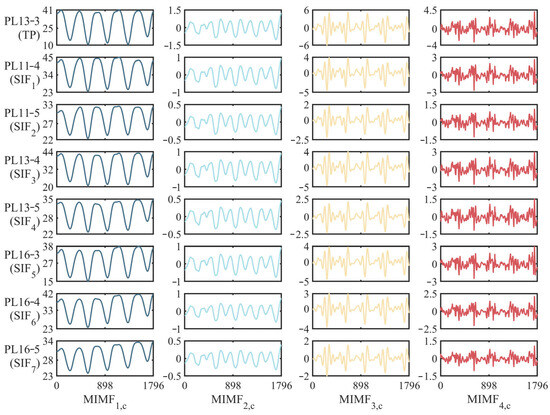 Based on the results in the previous subsection, a multi-point joint deformation monitoring model is established for the measurement points in zone 3. The measured data in zone 3 and the corresponding environmental quantities are illustrated in Figure 4. The model performance is analyzed and verified by taking the PL13-3 in zone 3 as an example. Figure 4c reveals that the relationship of the measured data of PL13-3 with environmental quantities is highly nonlinear, showing complexity and the need for a decomposition method to reduce its nonlinearity and fluctuation. PL13-3 is marked as the TP, and the same zone points PL11-4, PL11-5, PL13-4, PL13-5, PL16-3, PL16-4, and PL16-5 are the spatially associated points, marked as SIF1~SIF7. SMVMD decomposes TP and SIF1~SIF7. The maximum and minimum bandwidths α of the extracted modes were set as 1000 and 1, respectively. The time step of the dual ascending modes is 0, and the convergence and termination tolerances of the ADMM are 10−7 and 10−5, and , as the change rate of , is 1.414. Figure 5 reveals that reflects the overall fluctuation trend of the original deformation sequence and accounts for a larger proportion. In contrast, ~ accounts for a smaller proportion and has a higher frequency than .