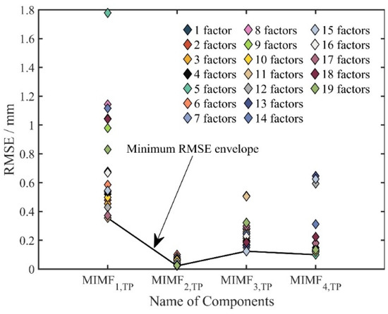 The corresponding input factor sets are selected for the components with different features to construct the component prediction models. MRMR performs factor screening, and the best factors set for each component are extracted. The maximum acceptable number of factors (1~19) for each component was firstly set by pre-setting. Then, the corresponding factor number results were filtered sequentially by the mRMR method, and the prediction accuracy of the model was obtained by inputting the corresponding factor number results into the prediction model. By comparing the prediction accuracies obtained by inputting different optimal factor numbers for each component, the minimum RMSE envelope is determined. Figure 6 shows the correlation between different amounts of factors in the input and the RMSE of the model, and the number of factors corresponding to different MIMF components is different. The deformation error varies when entering a different number of factors or the same number of different factors. Thus, for each MIMF is determined. Table 4 displays the optimal factor sets for each MIMF component identified through the mRMR screening process, and the factors are sorted by the degree of importance. It is found that each MIMF component is affected by the SIFs, and the degree of influence is larger than that of the environmental factor, demonstrating a spatial correlation between each point during the normal operation of the dam. In addition to the SIFs, and are also affected by the hydrostatic factor and the aging factor, and and are affected by the temperature factor.