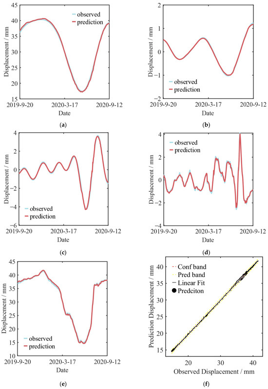 Predicted results for each component of the TP. (a) MIMF1; (b) MIMF2; (c) MIMF3; (d) MIMF4; (e) TP; (f) linear fit.