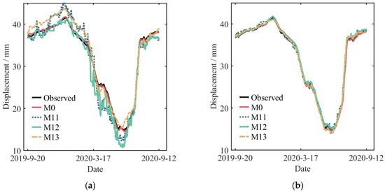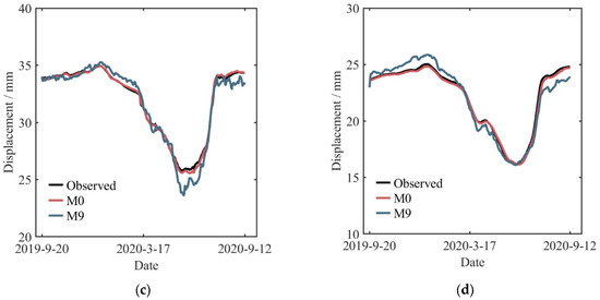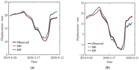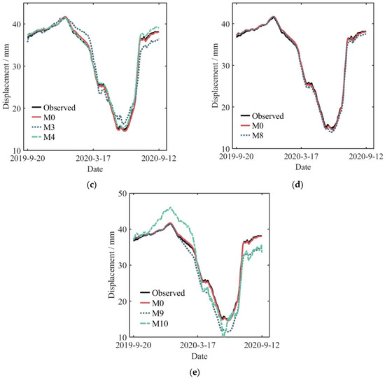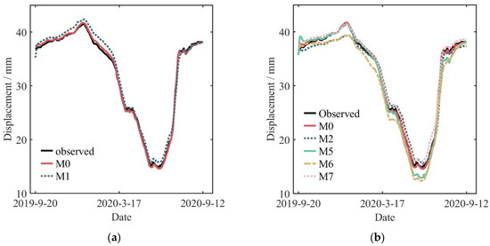 Secondly, the results of M0 and M2, M5, M6, and M7 (Figure 8b) indicate that M0 has the best results, M6 has the worst results, and the performance decreases in the order of M7, M5, and M2, which shows that SIFs have a great influence on the model, followed by LFs. It indicates that it is not enough to consider only the deformation data to construct the autoregressive model or to consider only the LFs, and the spatiotemporal characteristics of the deformation should be considered in calculations. Compared with M0 and M7, the indexes of M0 are better than those of M7, which proves that the reasonable selection of factors can improve the model prediction performance.