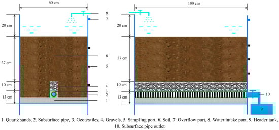The referenced field project had a depth of 150 cm, a filter material thickness of 30 cm, a backfill soil layer thickness of 112.5 cm, and an outer diameter of subsurface pipe of 7.5 cm. With reference to the laboratory subsurface pipe drainages, simulated experiments designed by Tao et al. (2016) with a 1:3 scale ratio were adopted for experiments []. The designed laboratory simulation test device for subsurface pipe drainage consisted of a water supply system, a seepage box, and a collector box. The seepage box was 1.0 m long, 0.6 m wide, and 0.8 m high (Figure 1). To prevent preferential flow along the wall during the leaching process, the inner layer of the testing device was polished with sandpaper. The depth of the subsurface pipe in the experimental device was 50 cm, and the thickness of the filter material was 10 cm. The thickness of the backfill soil was 37.5 cm, and the diameter of the subsurface pipe was 2.5 cm. The thickness of the organic glass around the seepage box was 8 mm. An overflow port was installed 5 cm away from the top of the seepage box to avoid excessive water accumulation during the leaching process, and three sampling ports were installed on the box wall.