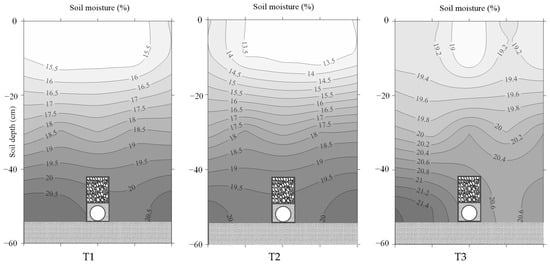 The measurements showed that the soil moisture contents in the depth of 0–60 cm ranged from 15.5 ± 0.45% to 20.5 ± 0.55% for scenario T1, from 13.5 ± 0.20% to 20.0 ± 0.75% for scenario T2, and from 19.0 ± 0.33% to 21.4 ± 0.88% for scenario T3, respectively (Figure 3). The soil moisture content of the three scenarios follows a decreasing trend as the soil depth increases. The moisture content in the region near the subsurface pipe was significantly higher than that in the upper soil layer. The geotextile and filter material wrapped around the subsurface pipe was conducive to the movement of water toward the subsurface pipe. The soil moisture content of scenario T3 in the depth of 0–60 cm was significantly higher than those of scenarios T1 and T2. There was a small difference in the soil moisture content between scenarios T1 and T2 in the depths of 20–40 cm and 40–60 cm. Scenario T2 had double-layer geotextiles, and the soil moisture content in the depth of 0–60 cm was the lowest among the three scenarios. The stacking of geotextiles allowed for a richer three-dimensional structure and enhanced the effects of permeability and filterability, especially in the triple-layer geotextile scenario.