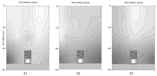 The salt content of the tested soils ranged from 71.17 to 99.86 g∙kg−1, and the salt content in the soil profiles of the three scenarios after leaching was below 4.8 ± 0.55 g∙kg−1 (Figure 4). The salinity of the soils in the three scenarios experienced an increasing trend as the soil depth increased. Scenario T1 had a soil profile salinity of less than 2.0 ± 0.22 g∙kg−1 in the 0–30 cm soil layer, which was the lowest among the three scenarios. The accumulated salinity was below 40 cm in the soil layer. The soil salt content in the 0–60 cm profile of scenario T3 was higher than those of scenarios T2 and T3. The soil salt content below 40 cm was higher than 3.9 ± 0.15 g∙kg−1. The salt distribution in the 0–60 cm profile of scenario T2 was relatively uniform, ranging from 2.3 to 3.0 g∙kg−1. Compared with the scenarios of the single-layer geotextile and the triple-layer geotextile, the salt leaching of scenario double-layer geotextile was more uniform. Therefore, moderate geotextile stacking has better effects on permeability and filterability, which could promote uniform salt leaching in the soil profile.