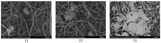 Particles in soils were entrained by moving water, with some particles passing through the geotextile into the drainage system while others intercepted by the geotextile. The soil particles were generally intercepted through clogging and siltation. Scenarios T1 and T2 resulted in siltation inside the geotextile, where fine soil particles were trapped in the fiber structure of the geotextile, leading to a decrease in its permeable area. Scenario T3 resulted in clogging of the upstream surface of the geotextile, where soil particles were collected to form a layer of low-permeability filter cakes on the upstream surface of the geotextile (Figure 5). Observations of the surface and internal structures of geotextile using scanning electron microscopy revealed that the pores of the geotextile wrapped around the subsurface pipe were clogged or blocked by the clusters composed of fine soil particles, resulting in a decrease in the water surface of the geotextile. Scenario T3 resulted in the formation of a clear and dense filter cake layer on the upstream surface. In scenarios T1 and T2, soil particles did not completely block the geotextile, and a large number of pores were present.