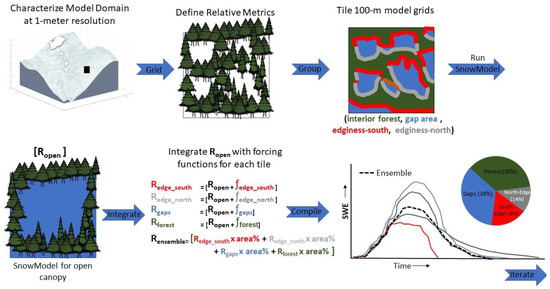 Generalized schematic of tiled model workflow to integrate empirical functions with SnowModel. The four canopy structure groupings were derived from the lidar data: (1) relative gap area (gap area), (2) forest edginess with a southern aspect (edginess-south), (3) forest edginess with a northern aspect (edginess-north), and (4) the interior forest defined from canopy closure.