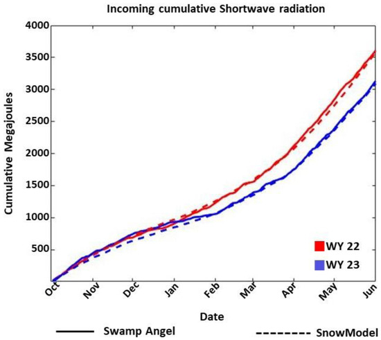 Comparison of cumulative incoming shortwave radiation data between water years (WY, October 1 through September 30 of the following year) from the Swamp Angel radiometer and SnowModel estimations for the Coal Creek field area of southwest Colorado.
