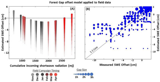 The left-hand panel (A) displays the estimated snow water equivalence (SWE) offset for relative gap areas of varying sizes (y-axis) during each field campaign from WY 2022 to WY 2023 as they relate to cumulative annual shortwave radiation (SWR) on the x-axis. The right-hand panel (B) displays the estimated (Equation (2)) SWE offset for forest gaps vs. the measured SWE offset. The printed point size relates to the size of the relative gap in both tiles. On the left-hand pane, the color relates to the time at which the data were collected. Water year (WY) is defined as October 1 through September 30th of the following year.
