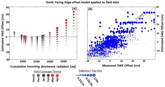 The left-hand panel (A) displays the estimated snow water equivalence (SWE) offset for north-facing edges of varying sizes (y-axis) during each field campaign from WY 2022 to WY 23 as it relates to cumulative annual shortwave radiation (SWR) on the x-axis. The right-hand panel (B) displays the estimated (Equation (3)) SWE offset for north-facing edges vs. the measured SWE offset. The printed point size relates to the size of the edge in both tiles. On the left-hand panel, the color relates to the time at which the data were collected. Water year (WY) is defined as October 1 through September 30th of the following year.